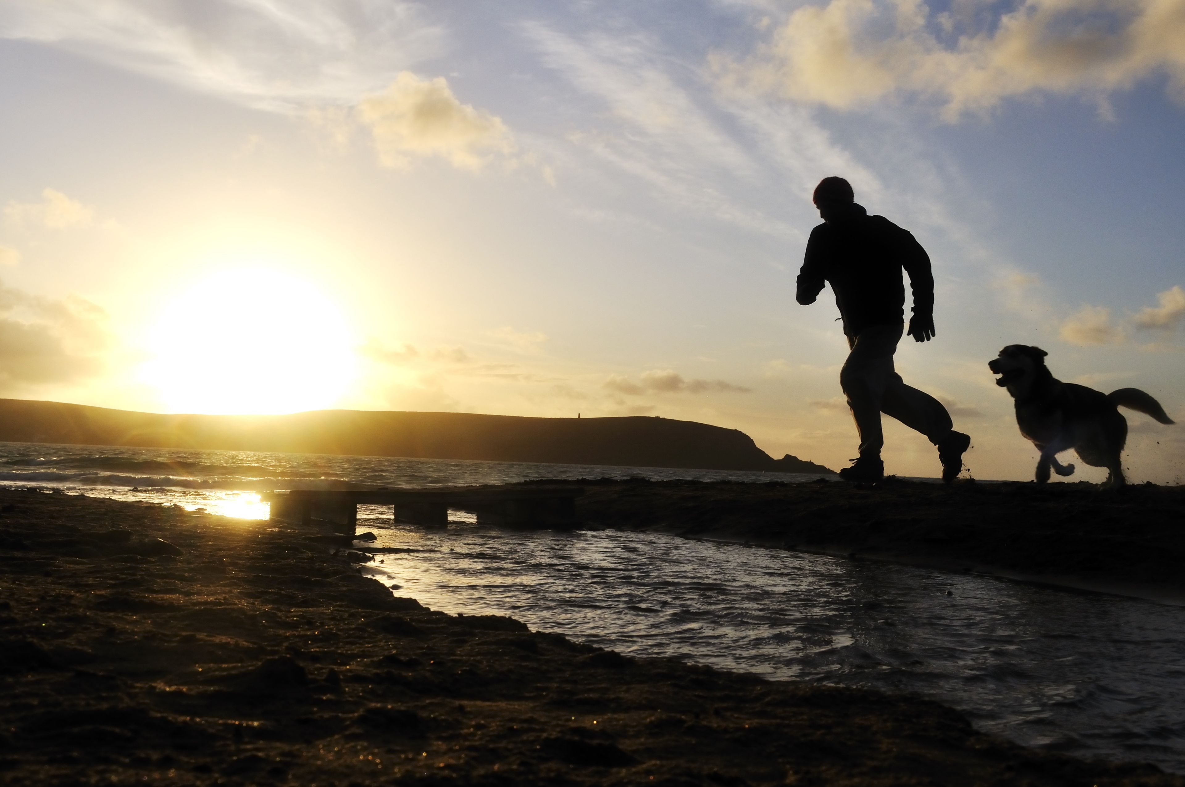 Corretea delante del hombre. El hombre lleva en su mano la cadena con que lo